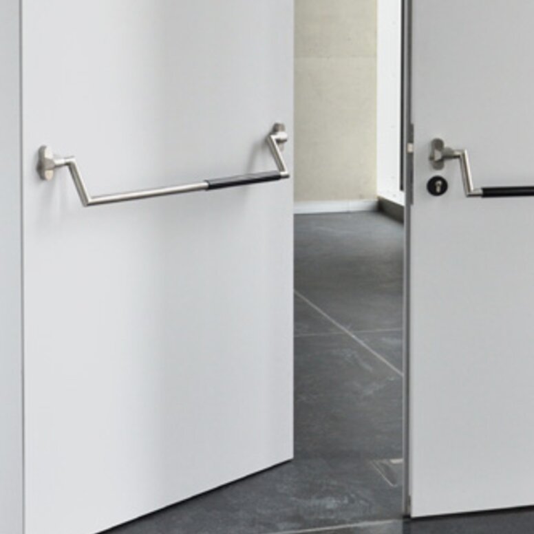 In contrast to this is the administration and seminar complex, which is transparently designed with a glass façade and offers, for example, a maximum of flexible use and networking through decentralised technology. The contrast between open and closed is reflected in the chosen black and white contrasts. In the laboratory area the walls are black and the floors are made of white epoxy resin. In the seminar area, on the other hand, the walls are white and the floors are covered with black carpet. The dynamic shape of the administration building is reflected in the flowing form of the door handles. Here series 120 in black was used.