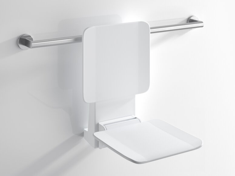 HEWI suspended seats can be added particularly easily in the shower. They are simply hooked into permanently installed HEWI shower handrails or grab rails and secured with them.
