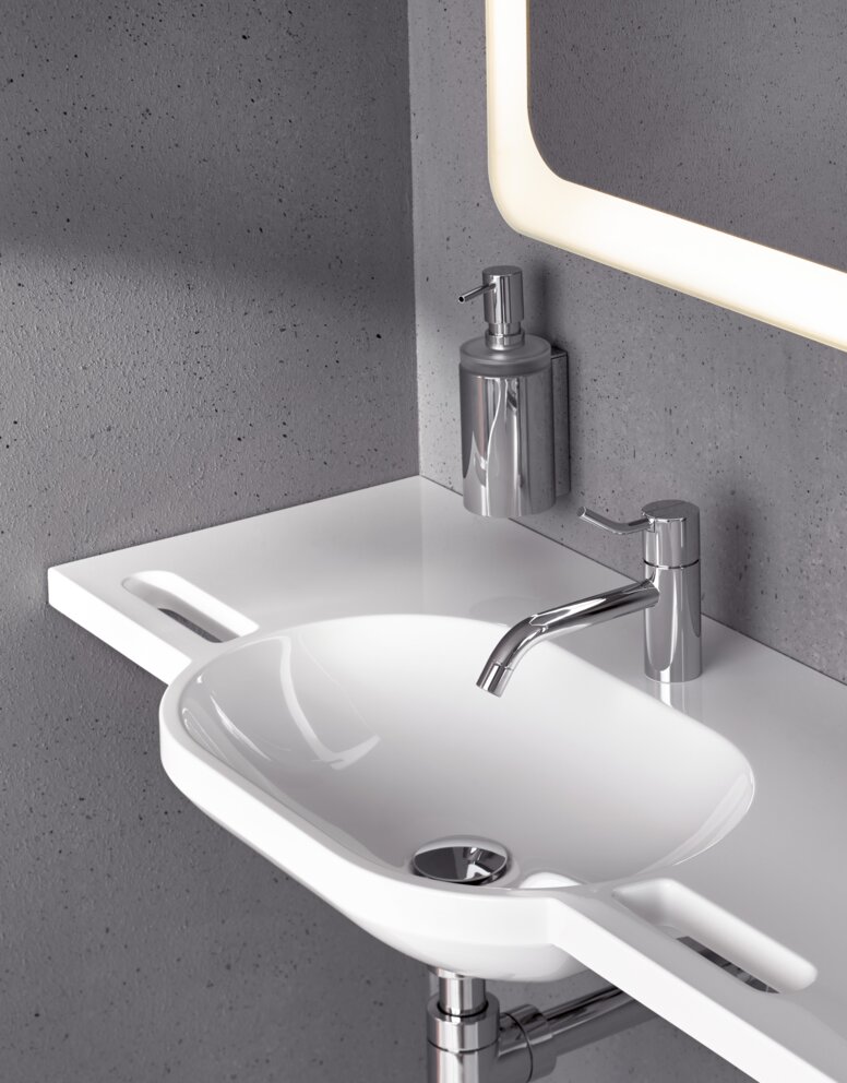 Les lavabos avec poignées intégrées sont l'exemple parfait du design universel. Les fentes dans le matériau qui constitue le lavabo ressemblent à des porte-serviettes – et peuvent bien évidemment aussi être utilisées pour cela - mais elles servent également de poignées. Les possibilités de préhension dans l'environnement du lavabo sont particulièrement importantes en cas de force et de mobilité réduites. Les lavabos à poignées intégrées offrent des possibilités de préhension latérales ou frontales. Ils permettent ainsi une prise en main agréable et offrent aux utilisateurs un soutien précieux au quotidien.